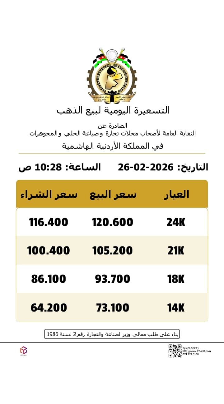 ووفقا للنشرة اليومية الصادرة عن النقابة العامة لأصحاب محالّ تجارة وصياغة الحلي والمجوهرات، بلغ سعر الغرام الواحد من الذهب عيارات 24 و18 و14 لغايات البيع من محالّ الصاغة 120.60 و93.70 و73.10 دينارا على الترتيب.