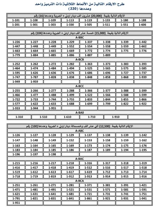 السوسنةطرحت إدارة الترخيص اليوم الخميس أرقامًا ثلاثية مميزة من ترميز / 1 للبيع عبر بوابتها الإلكترونية، بعد نفاد الأرقام الثلاثية التي تم طرحها مؤخراً.