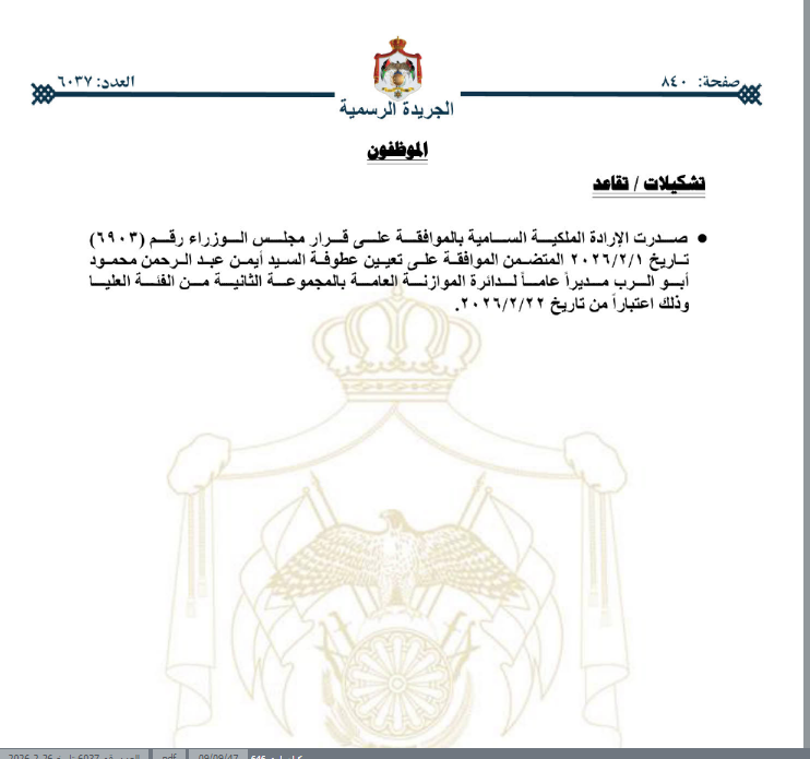 كما صدرت الإرادة الملكية السامية بتعيين أيمن أبو الرب مديرًا عامًا لدائرة الموازنة العامة، وتاليًا تفاصيل الإرادة