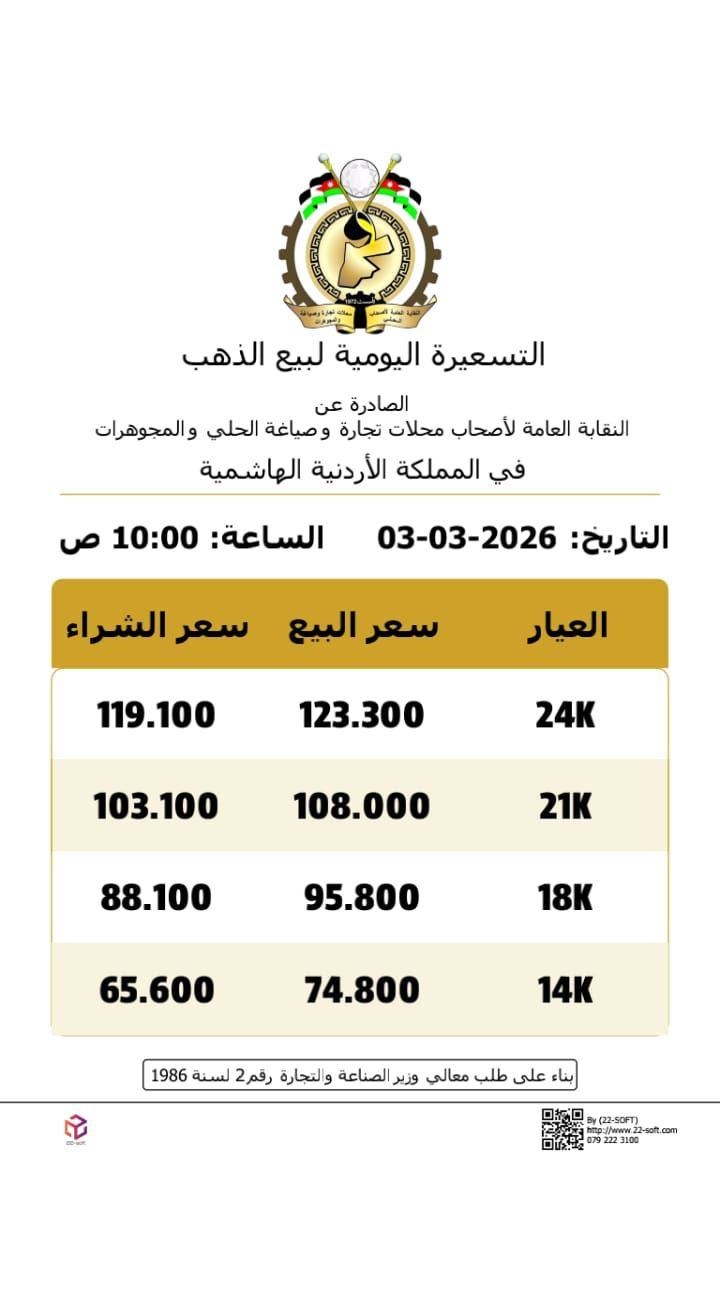وبحسب التسعيرة فقد بلغ سعر بيع غرام الذهب من عيار 24 نحو 123.300 دينار، مقابل 119.100 دينار للشراء، فيما وصل سعر بيع عيار 21، الأكثر تداولًا، إلى 108.000 دنانير، مقابل 103.100 دنانير للشراء.