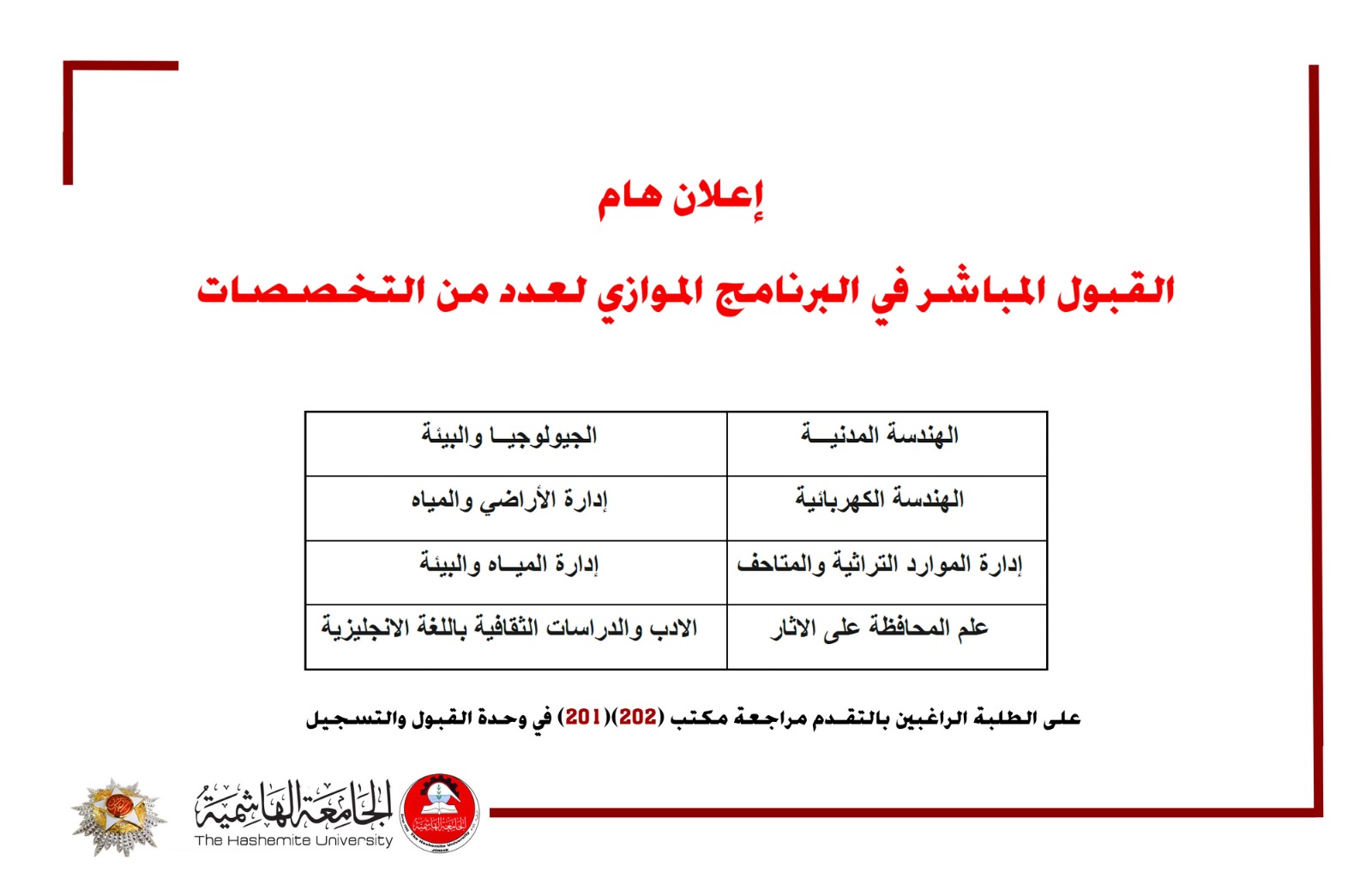 الهاشمية تفتح القبول المباشر للبرنامج الموازي في 8 تخصصات
