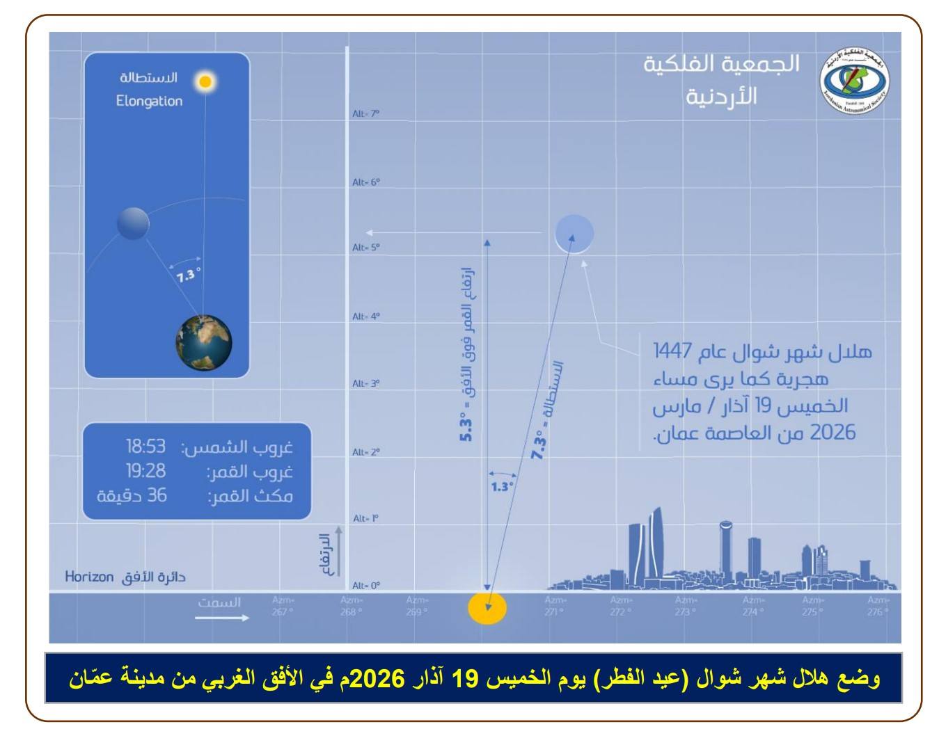 ويستند التقرير إلى حسابات برنامج "المواقيت الدقيقة" الذي أعدّه الفلكي محمد عودة، إلى جانب نماذج محاكاة لوضع الهلال في الأفق الغربي لمدينة عمّان.