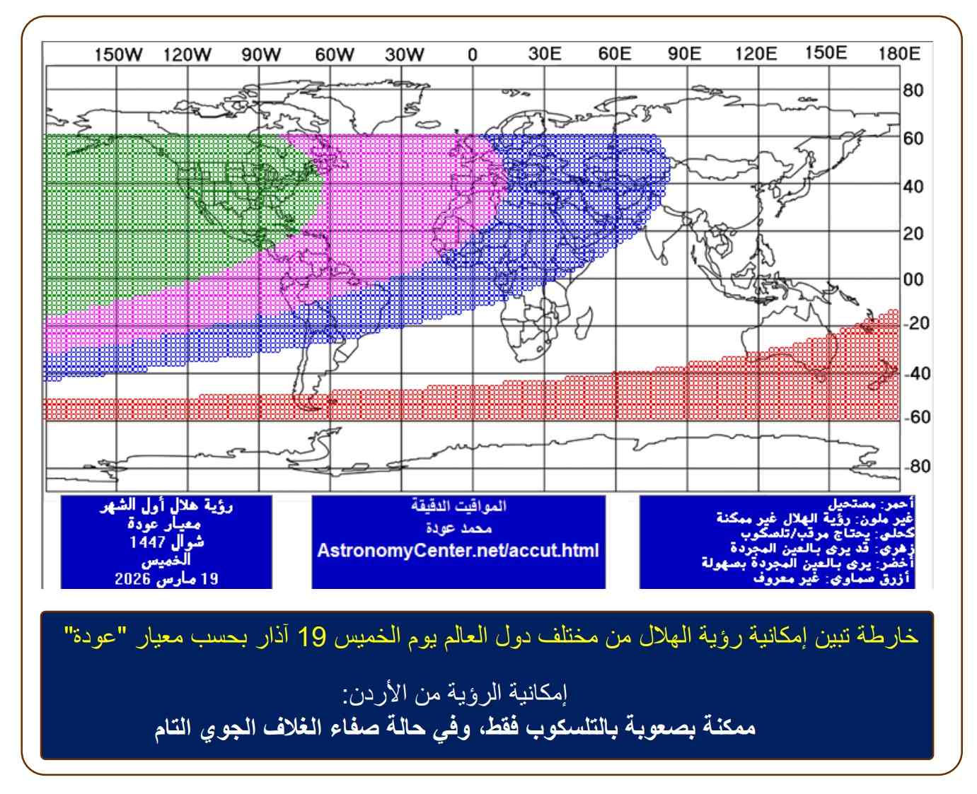 كما أظهرت الخرائط الفلكية المرفقة تفاوتا عالميا في إمكانية رؤية الهلال وفق معيار "عودة"، حيث تكون الرؤية ممكنة في بعض المناطق باستخدام الأجهزة البصرية، في حين تتعذر في مناطق أخرى.