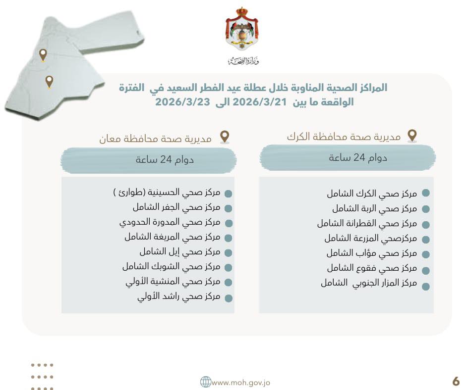 السوسنة - أعلنت وزارة الصحة، الخميس، عن أسماء المراكز الصحية المناوبة خلال عطلة عيد الفطر السعيد في الفترة الواقعة ما بين 21-23 آذار 2026, في جميع المحافظات.