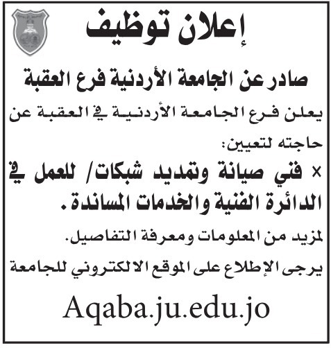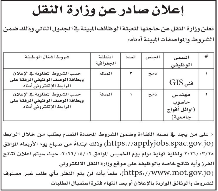 أعلنت كل من وزارة النقل، والجامعة الأردنية فرع العقبة، الأربعاء عن حاجتهما لتعبئة وظائف شاغرة.
