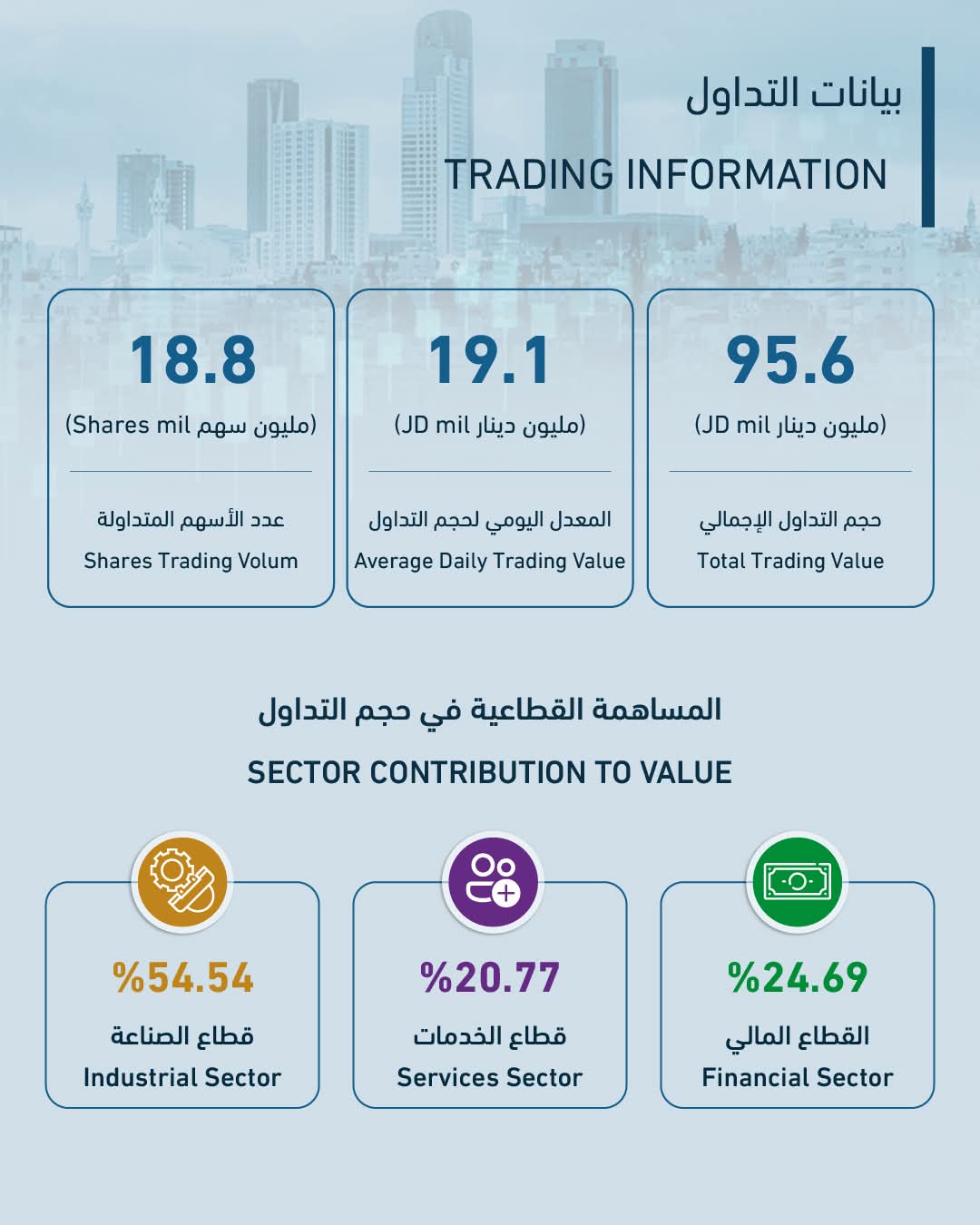 وعلى صعيد التوزيع القطاعي لحجم التداول، احتل قطاع الصناعة المرتبة الأولى بحجم بلغ 52.13 مليون دينار، وبنسبة 54.54 بالمئة من إجمالي حجم التداول، تلاه القطاع المالي بحجم 23.60 مليون دينار وبنسبة 24.69 بالمئة، فيما جاء قطاع الخدمات في المرتبة الثالثة بحجم 19.85 مليون دينار وبنسبة 20.77 بالمئة.