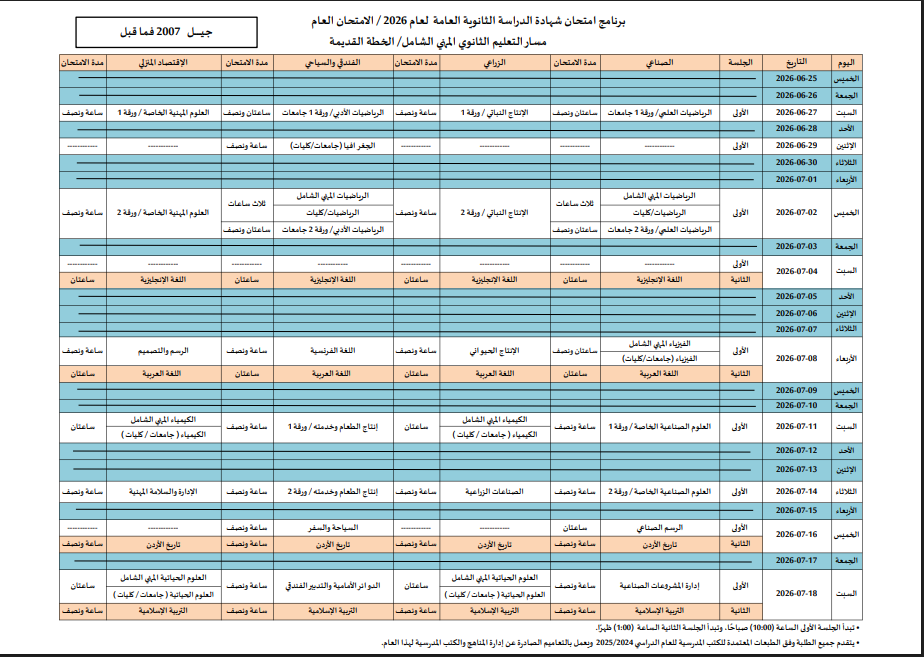 السوسنة - أعلنت وزارة التربية والتعليم الأحد، عن جدول امتحانات شهادة الدراسة الثانوية العامة لعام 2026 لطلبة الصف الثاني عشر.