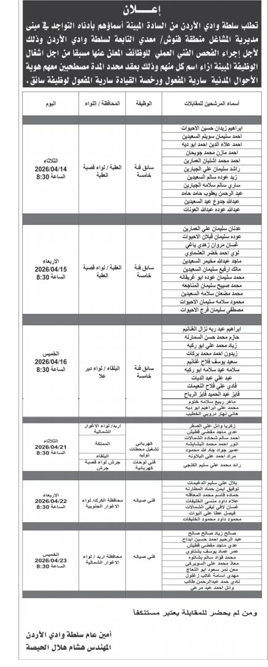 مدعوون لاجراء الفحص الفني العملي بسلطة وادي الأردن .. أسماء