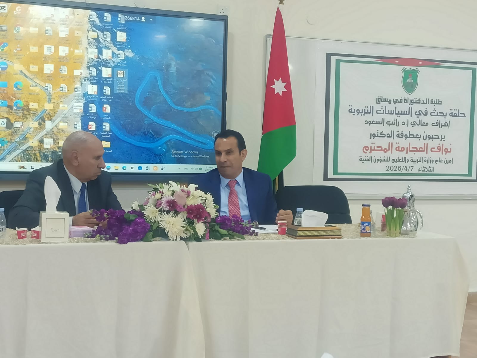 قدّم أمين عام وزارة التربية والتعليم للشؤون الفنية والتعليمية الدكتور نواف العجارمة، محاضرة بعنوان "السياسات التربوية في الأردن" لطلبة مساق البحث في السياسات التربوية لطلبة برنامج الدكتوراة في القيادة التربوية في الجامعة الأردنية.