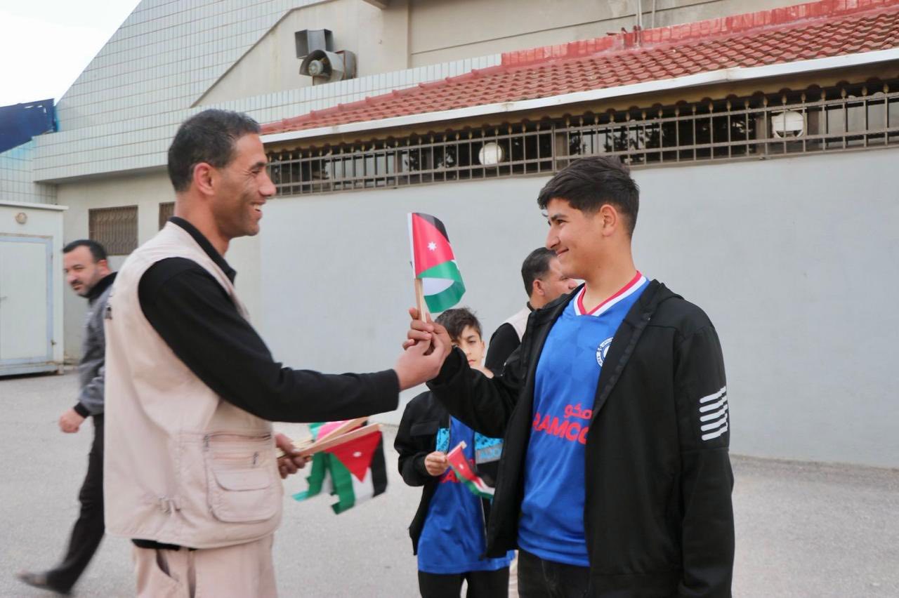 السوسنة - نشامى وحدة أمن الملاعب وقبيل انطلاق مجريات مباراة دوري المحترفين الأردني لكرة القدم بين فريقي (الحسين اربد و الرمثا) ، يقومون بتوزيع الأعلام الأردنية على جماهير الفريقين وذلك ضمن احتفالات المملكة "بيوم العلم" ، حيث عكست المبادرة روح الولاء والانتماء ومعاني الفخر بالوطن .