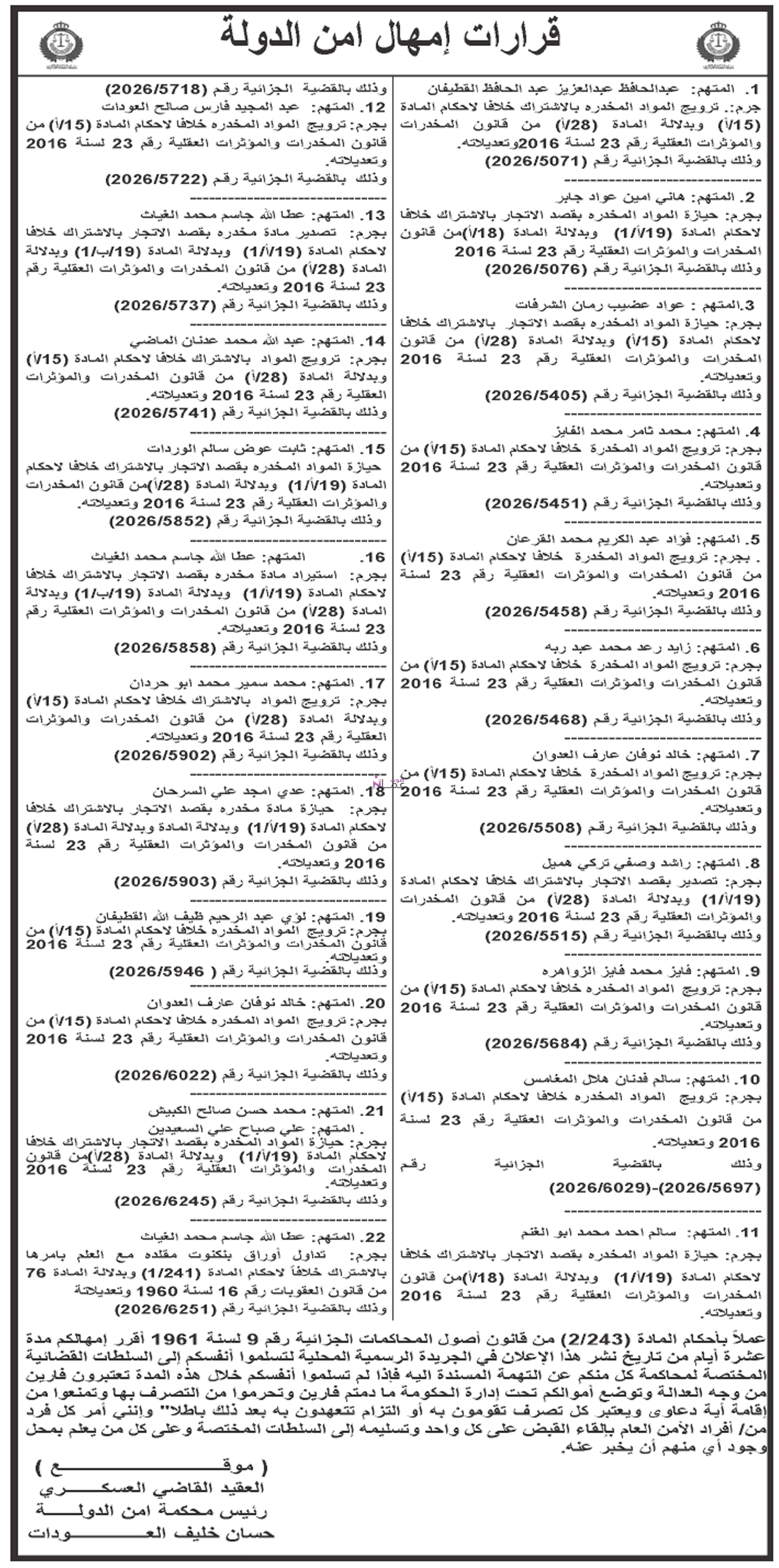 واكد رئيس محكمة امن الدولة القاضي العسكري حسان خليف العودات انه في حال عدم تسليم المتهمين انفسهم خلال المهلة المحددة، سيتم اعتبارهم فارين من وجه العدالة، مع اتخاذ اجراءات قانونية مشددة بحقهم. واضاف ان من بين هذه الاجراءات وضع اموال المتهمين تحت ادارة الحكومة طوال فترة فرارهم، وحرمانهم من التصرف بها، الى جانب منعهم من اقامة اي دعاوى قانونية.
