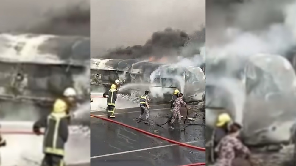 وقال الناطق الرسمي إنّ الطواقم المتخصصة العاملة في مديرية دفاع مدني الطريق الصحراوي والشرطة، وبإسناد من مديريتي دفاع مدني الكرك ومأدبا ومجموعة إسناد الجنوب، تعاملت مع الحادث، مبينا أنه نتج عنه اشتعال الصهريج والشاحنات.