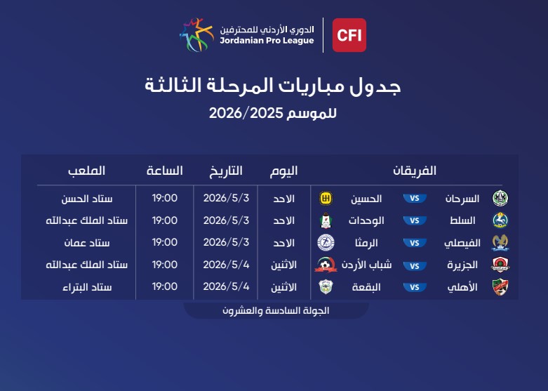 أصدر الاتحاد الأردني لكرة القدم، جدول مواعيد وأماكن إقامة مباريات الأسبوع الـ26، من الدوري الأردني للمحترفين CFI لموسم 2025/2026.